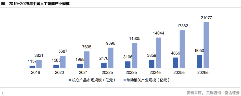 跟着生成式人工智能手艺的快速成长,其对社会的影响日益显著,因而全球将加强对其节制性、对齐性和可注释性方面的监管。生成式人工智能行业财产链涵盖了从根本层到使用层的多个环节。上逛根本层包罗原始数据的收集、处置、标注等以及支撑生成式AI模子的锻炼和推理的算力。下逛使用层的智能帮手、聊器人等使用曾经普遍普及,为用户供给了便利的办事,而生成式AI正在聪慧教育、聪慧安防等范畴的使用不竭拓展,提拔了公共办事程度和效率。 2021年人工智能焦点财产规模估计达到1998亿元规模,估计将于2026年跨越6000亿元,对应2021年到2026年的CAGR为24。8%,带动财产规模跨越2万亿元。跟着越来越多的头部企业登岸本钱市场,市场份额将进一步集中。