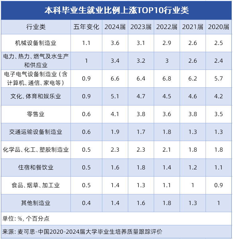 对于面对升学选择的高中生而言,专业的挑选关乎将来的职业成长轨迹。领会当下及将来的就业趋向,找准那些人才需求兴旺、成长潜力凸起的行业,能让专业选择更具前瞻性。近五年,我国本科结业生就业市场一批行业类凭仗强劲的成长动力,成为吸纳结业生的主要阵地。接下来小优将为你细致解读就业比例上涨TOP10行业类,找准适配的专业标的目的,为你的升学规划供给参考。 这10个行业类的分布特征明显:制制业相关行业占领从导,涵盖机械设备、电子电气设备等多个细分范畴,占TOP10中的6席。这一态势表现了我国制制业转型升级成效,高端配备制制、电子消息等焦点范畴对专业本科人才需求兴旺。同时,能源保障、消费升级、平易近生办事等类行业的稳步增加,也为大师将来职业选择供给了更多元标的目的,这些增加显著行业对应的专业范畴,值得沉点关心。机械设备制制业是支持国平易近经济成长的主要根本财产,当前正加快向高端化、智能化、绿色化转型,笼盖工业出产、根本设备扶植等多个环节范畴,高端配备制制、细密仪器研发等标的目的对本科手艺人才的需求持续攀升。该专业是机械类的保守王牌专业,焦点是培育控制机械设想、学生将进修若何设想合适需求的机械产物,优化出产工艺流程,处理出产中的手艺难题,具备从产物研发到出产落地的全流程参取能力。报考需具备结实数学、物理根本,力学学问尤为环节。升入大学后需注沉实践,工业练习取学科竞赛,考取CAD工程师认证提拔合作力。就业面广,可入职汽车制制、工程机械、航空航天等企业,处置机械设想、工艺、设备办理等岗亭,需留意部门岗亭需驻厂或深切车间,工做相对艰辛,做息需贴合出产节拍,报考前可提前领会。 做为一门融合机械工程、从动化手艺、计较机科学的交叉学科,智能制制工程专业,聚焦于数字化工场扶植和智能配备研发,旨正在培育可以或许使用先辈手艺对保守出产模式进行升级主要根本财产,渗入于出产糊口各范畴。近年来正在精细化工财产沉点搀扶、行业正向高端化、绿色化转型,新材料研发、保守产物升级等需求,为本科手艺人才供给了不变且有潜力的就业平台。 该专业是化工行业的焦点专业,培育控制化学工程道理、化工工艺设想、化学反映工程、化工设备等学问的手艺人才,学生将具备化工出产流程设想、工艺优化、产质量量节制、化工设备研发等分析能力,报考需结实化学、数学根本,沉点控制无机化学、无机化学学问。大学进修中注沉尝试取练习,参取化工出产练习、工艺设想项目堆集经验,树立绿色化工取平安出产。就业可入职中石化、中石油等大型化工企业,及精细化工、新材料企业,处置工艺工程师、出产手艺办理、产物研发等岗亭,也可进入环保部分担任化工废水、废气处置,职业笼盖面广,不变性强。