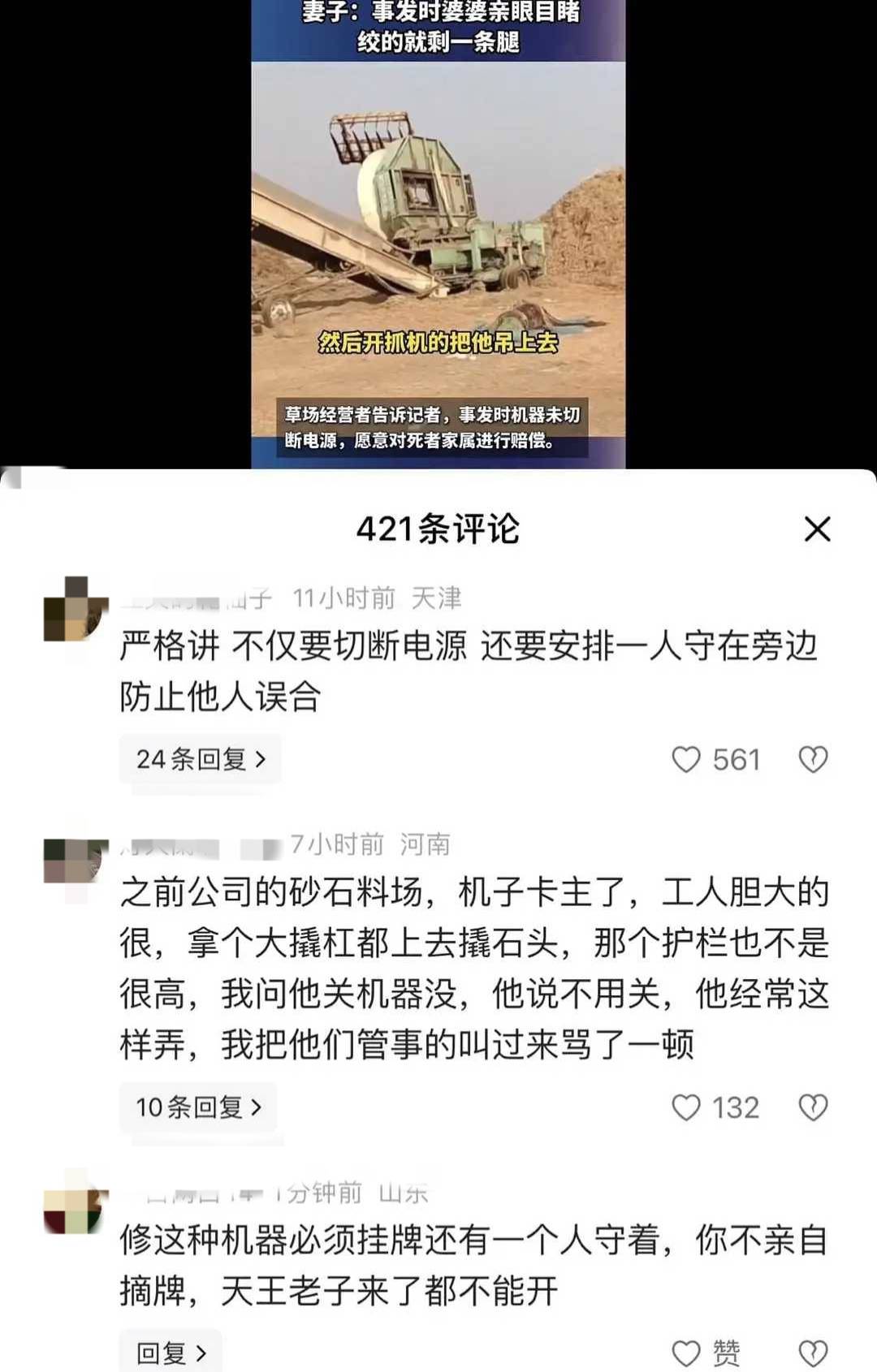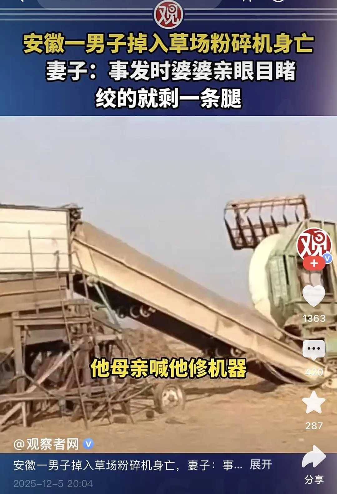 不意正在维修过程中,本来停运的破坏机俄然启动,丈夫霎时被卷入运转的机械中,现场环境十分惨烈。 更让人揪心的是,王密斯的婆婆其时也正在该草场工做,全程目睹了这起悲剧的发生。 让人非常的是,这一被须眉的婆婆就地目睹,白叟霎时情感解体,痛哭不止,正在场村平易近见状赶忙上前安抚并告急报警。 12月5日,安徽淮北有市平易近向爆料一则令人的动静:其丈夫正在草场维修破坏机时,机械俄然不测启动,须眉倒霉被卷入机身,最终身亡。 爆料人王密斯(死者老婆)回忆,事发时间为11月20日,其时草场的破坏机因草料堵塞呈现毛病,她丈夫前去现场检修。